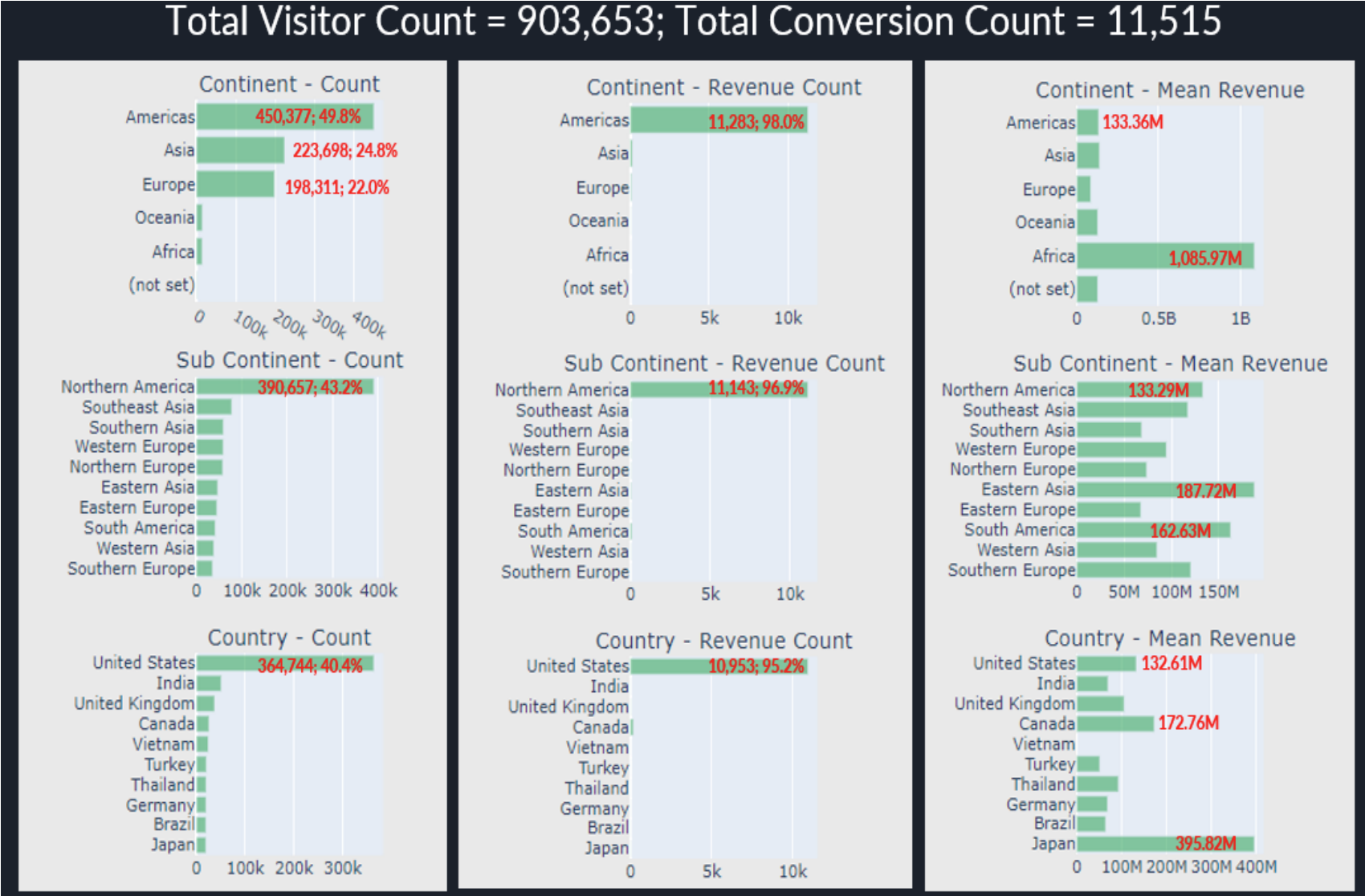 An insightful facet from the preprocessed data looked into geographics for Google Store's online visitors. As displayed above in Fig. 2.1, we discovered that the majority of online visitors originated from the Americas (in both overall quantity and how many converted or contributed towards the Google Store's online revenue). However, the average revenue from conversions indicated that visitors from Africa were spending more than visitors from different continents. Our group recommended for the business analytics to look into this deeper, and investigate what could be done to replicate higher average revenue for other continents.